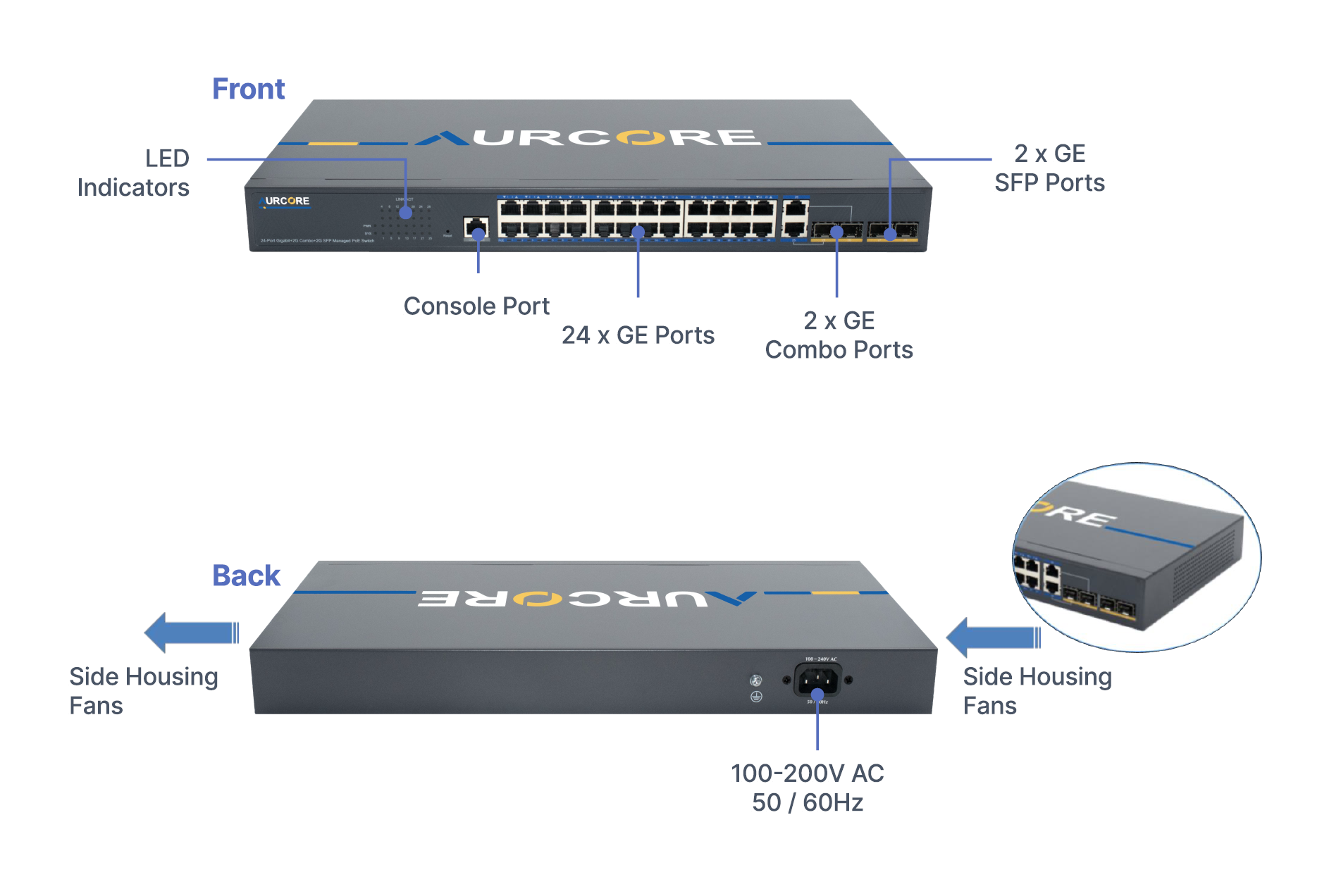 The AES2002P is a robust, enterprise-grade managed Ethernet switch designed to meet the demands of modern networks across commercial and industrial environments. Built for high reliability and seamless integration, it supports advanced traffic management, secure segmentation, and centralized control through AURC-NOS using ACC & ACN platforms.