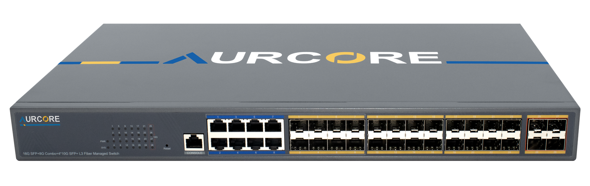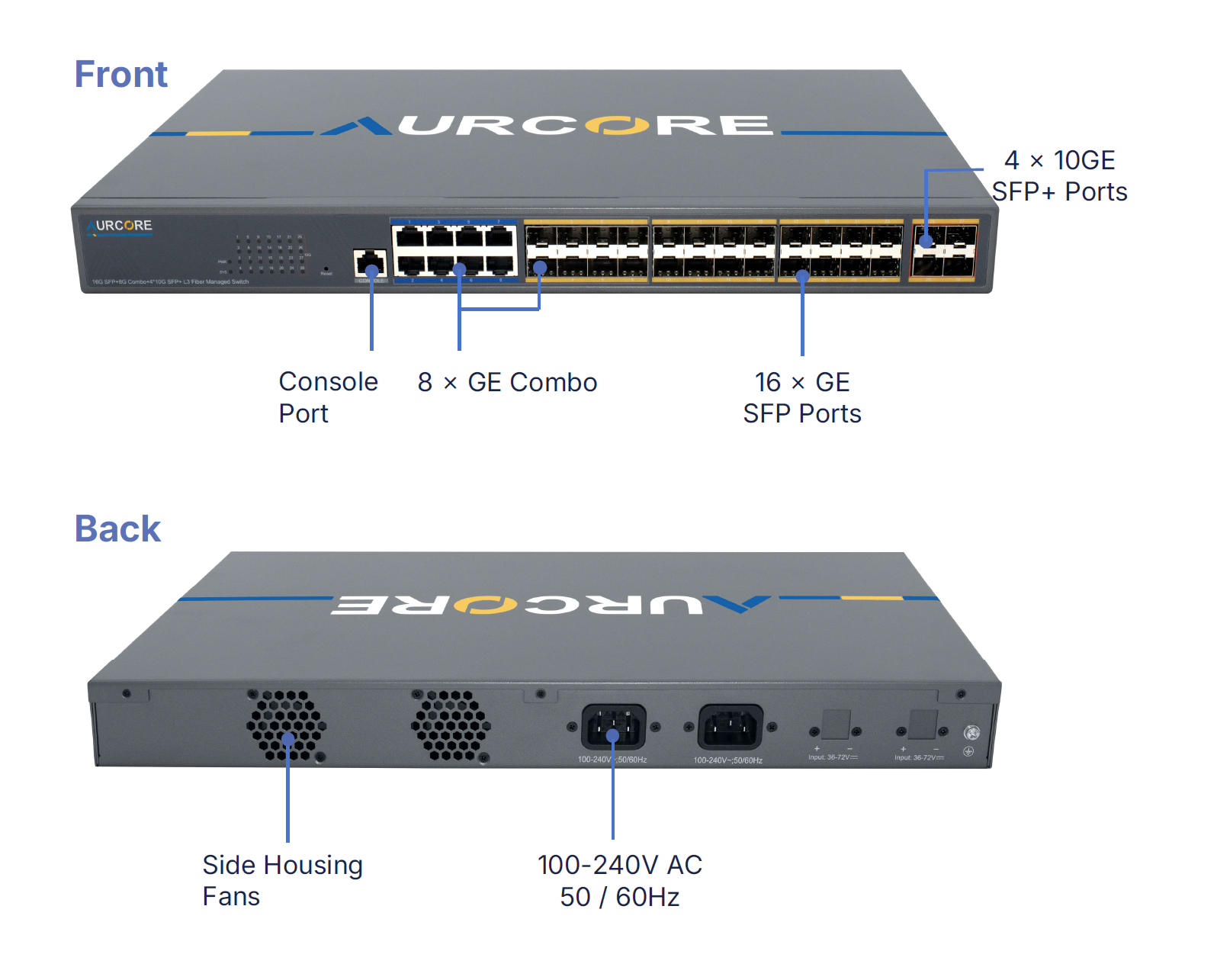| Interface | 16 x GE SFP | 8 x GE Base-T/SFP Combo | 4 x 10 GE SFP+ | L3 |