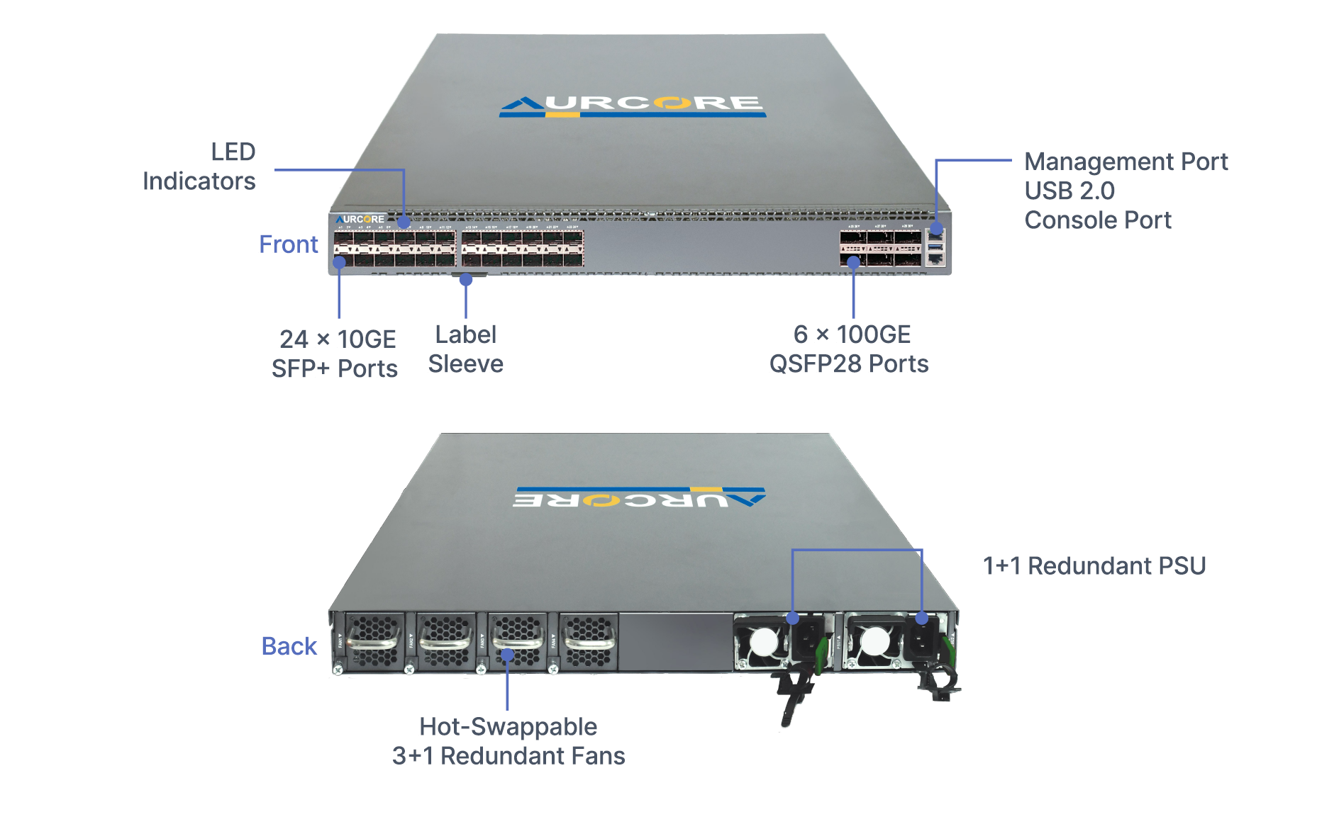 | Interface | 24 x 10GE SFP+ Slots | 6 x 100GE QSFP28 Slots |