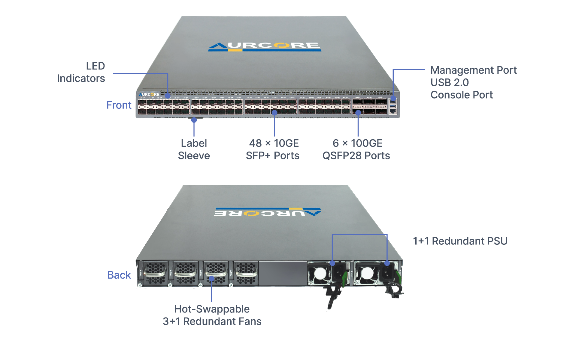 | Interface | 48 x 10GE SFP+ Slots | 6 x 100GE QSFP28 Slots |