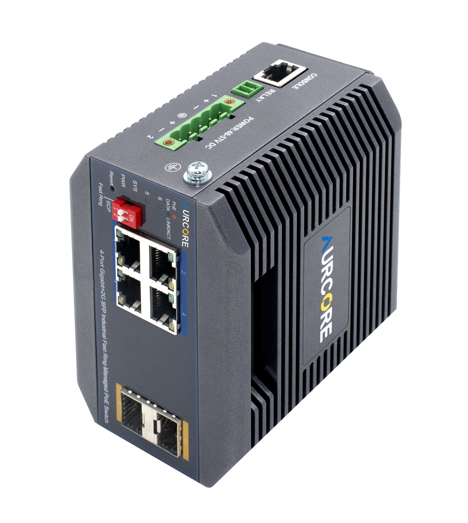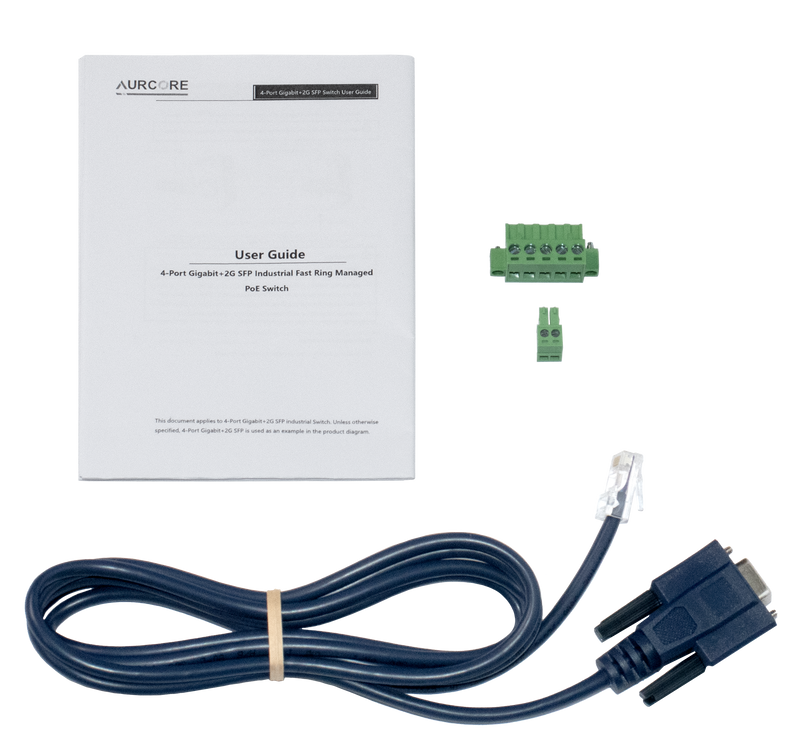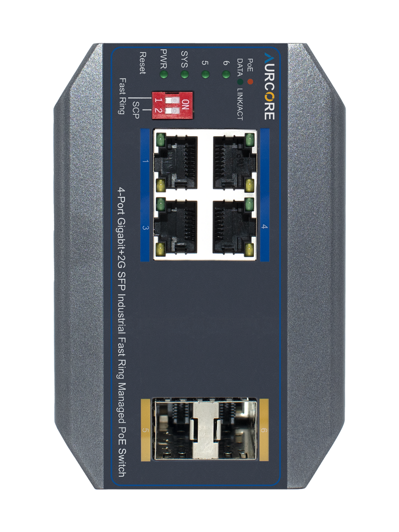 Note: A Power Supply Unit (PSU) is required for operation and is sold separately. For guaranteed compatibility and optimal performance, AurCore Technology recommends Mean Well power supplies, which have been fully tested and verified with our industrial switches.