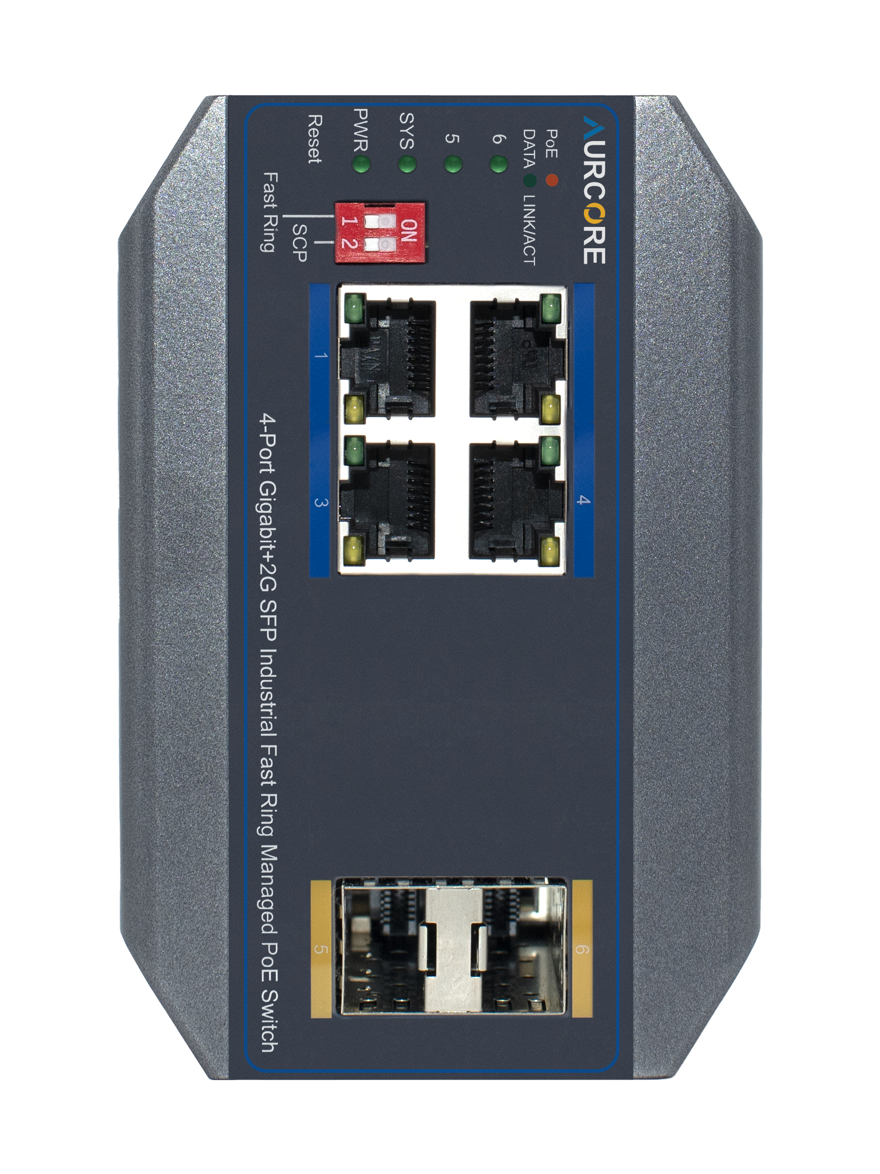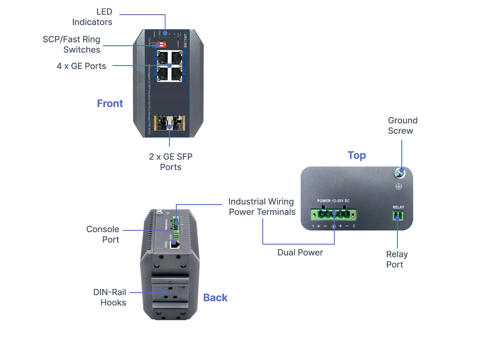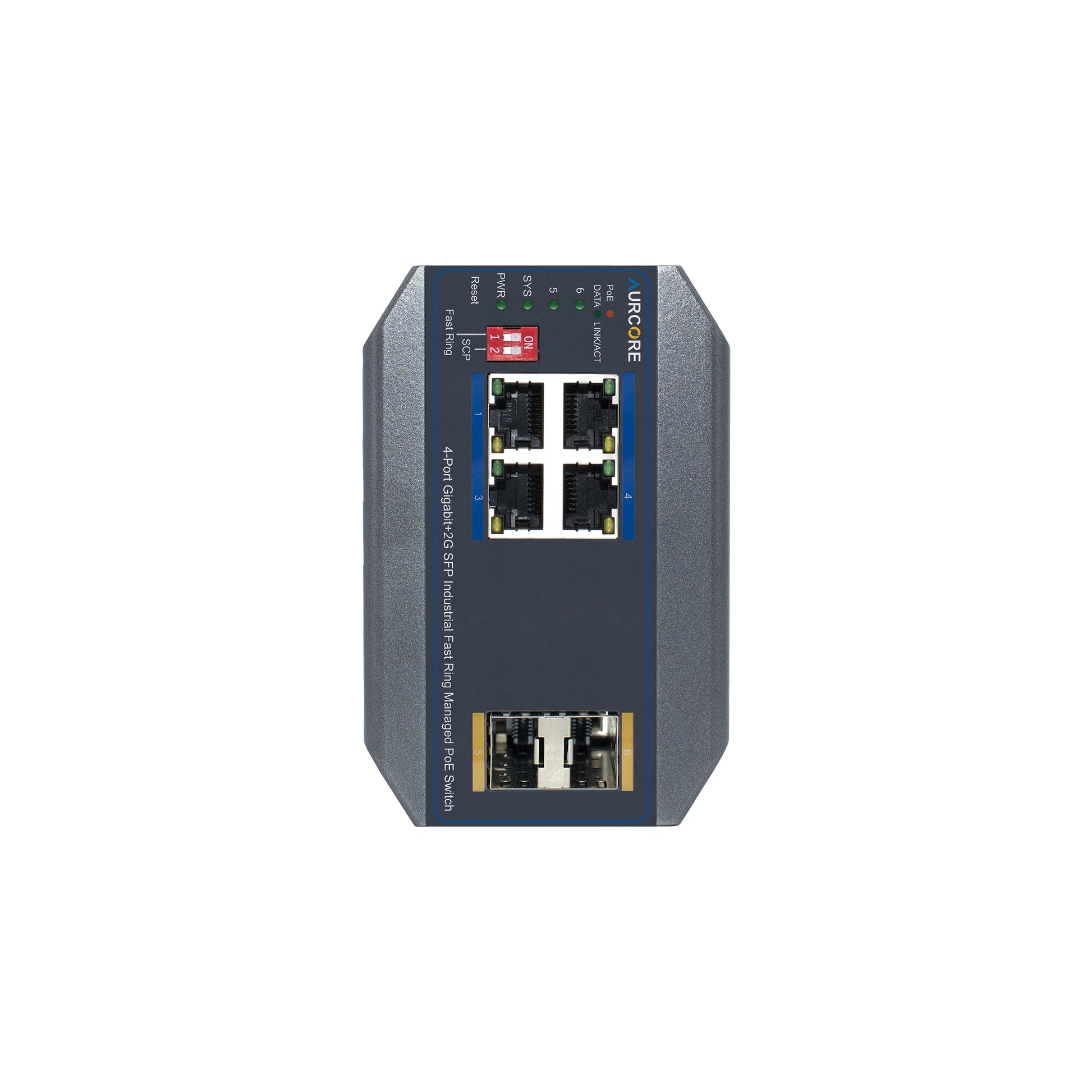 Note: A Power Supply Unit (PSU) is required for operation and is sold separately. For guaranteed compatibility and optimal performance, AurCore Technology recommends Mean Well power supplies, which have been fully tested and verified with our industrial switches.