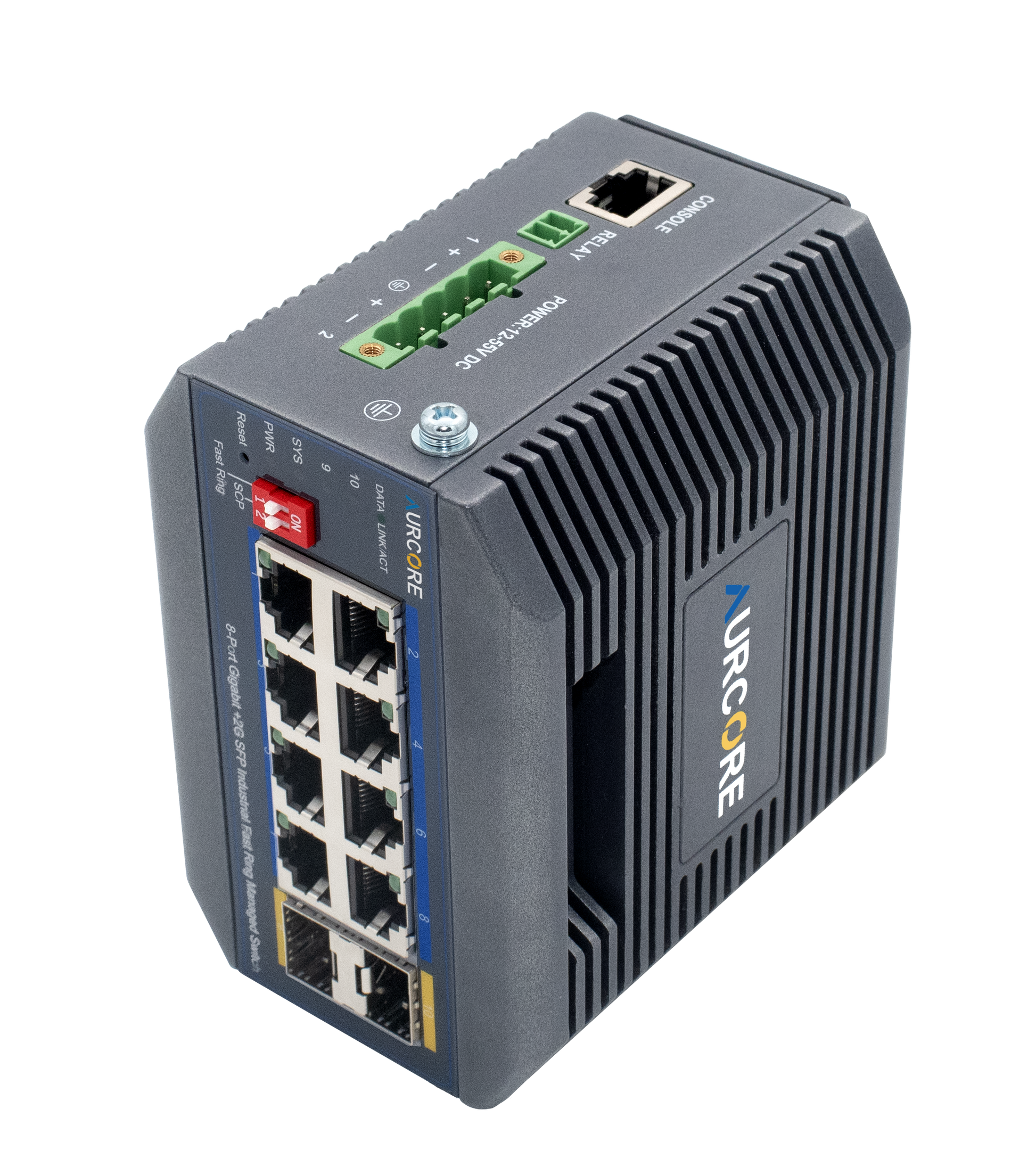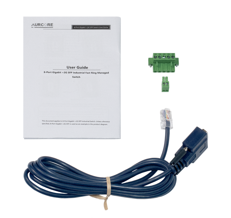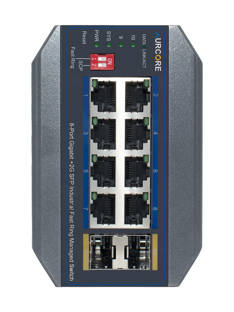 Note: A Power Supply Unit (PSU) is required for operation and is sold separately. For guaranteed compatibility and optimal performance, AurCore Technology recommends Mean Well power supplies, which have been fully tested and verified with our industrial switches.