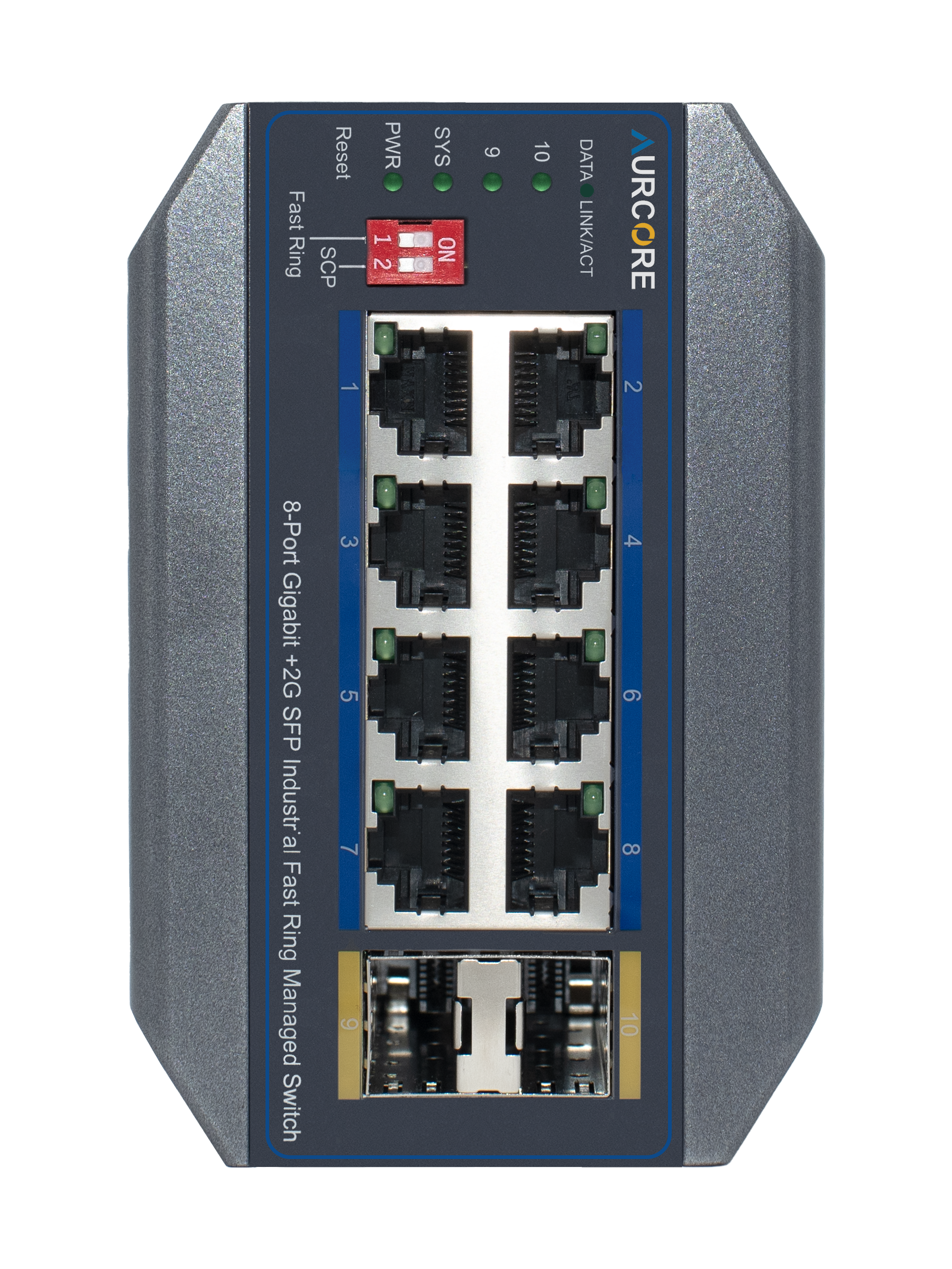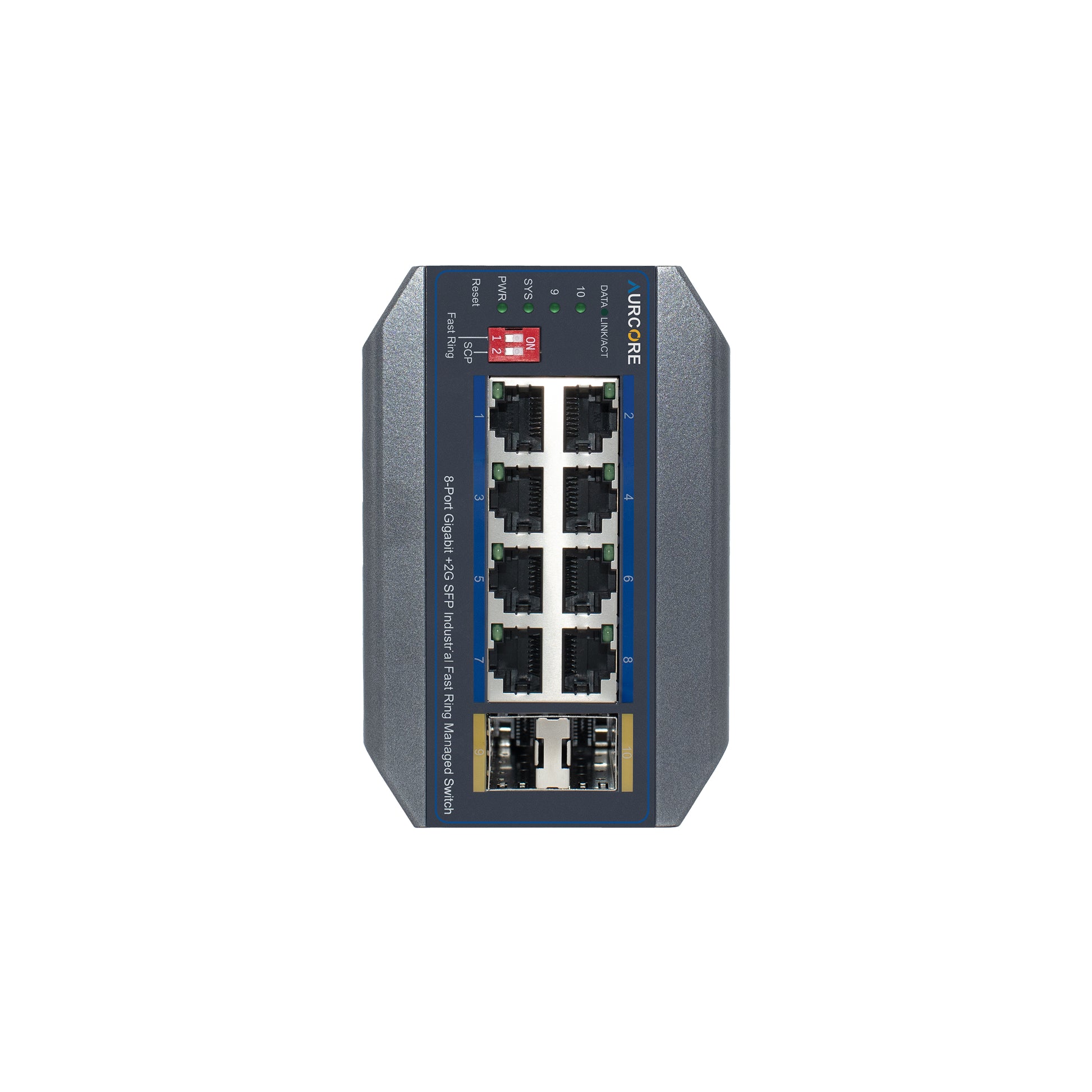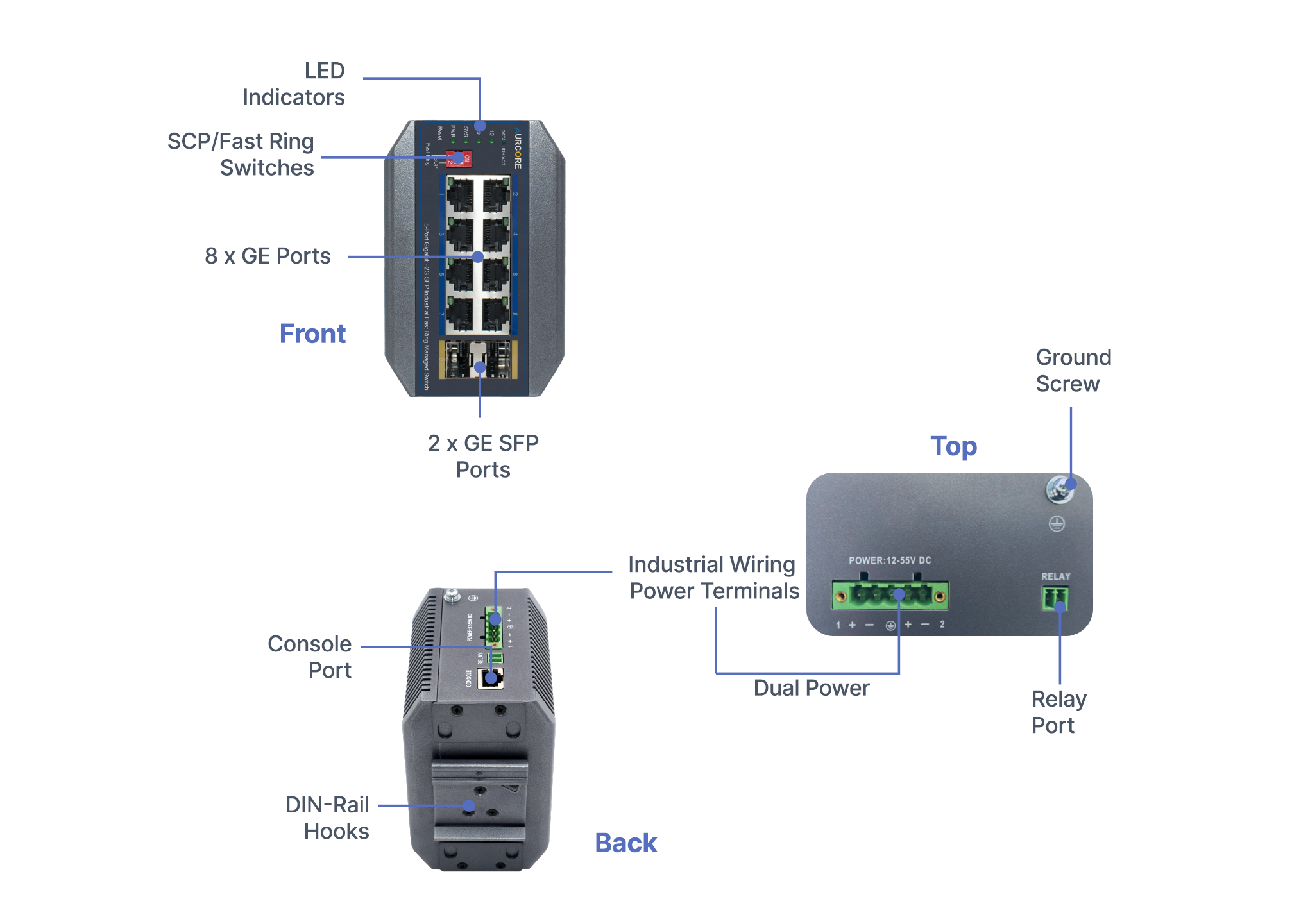 Note: A Power Supply Unit (PSU) is required for operation and is sold separately. For guaranteed compatibility and optimal performance, AurCore Technology recommends Mean Well power supplies, which have been fully tested and verified with our industrial switches.