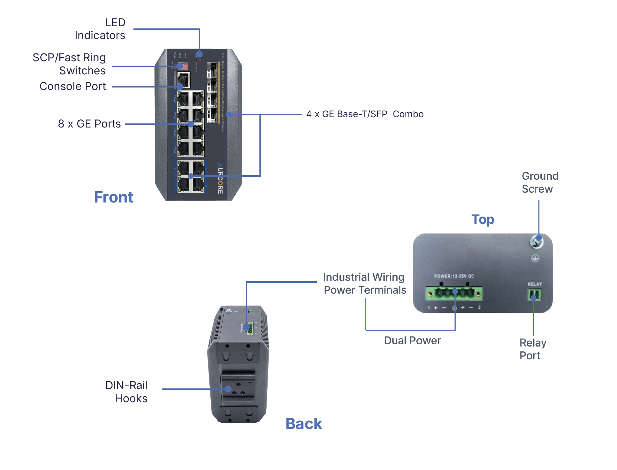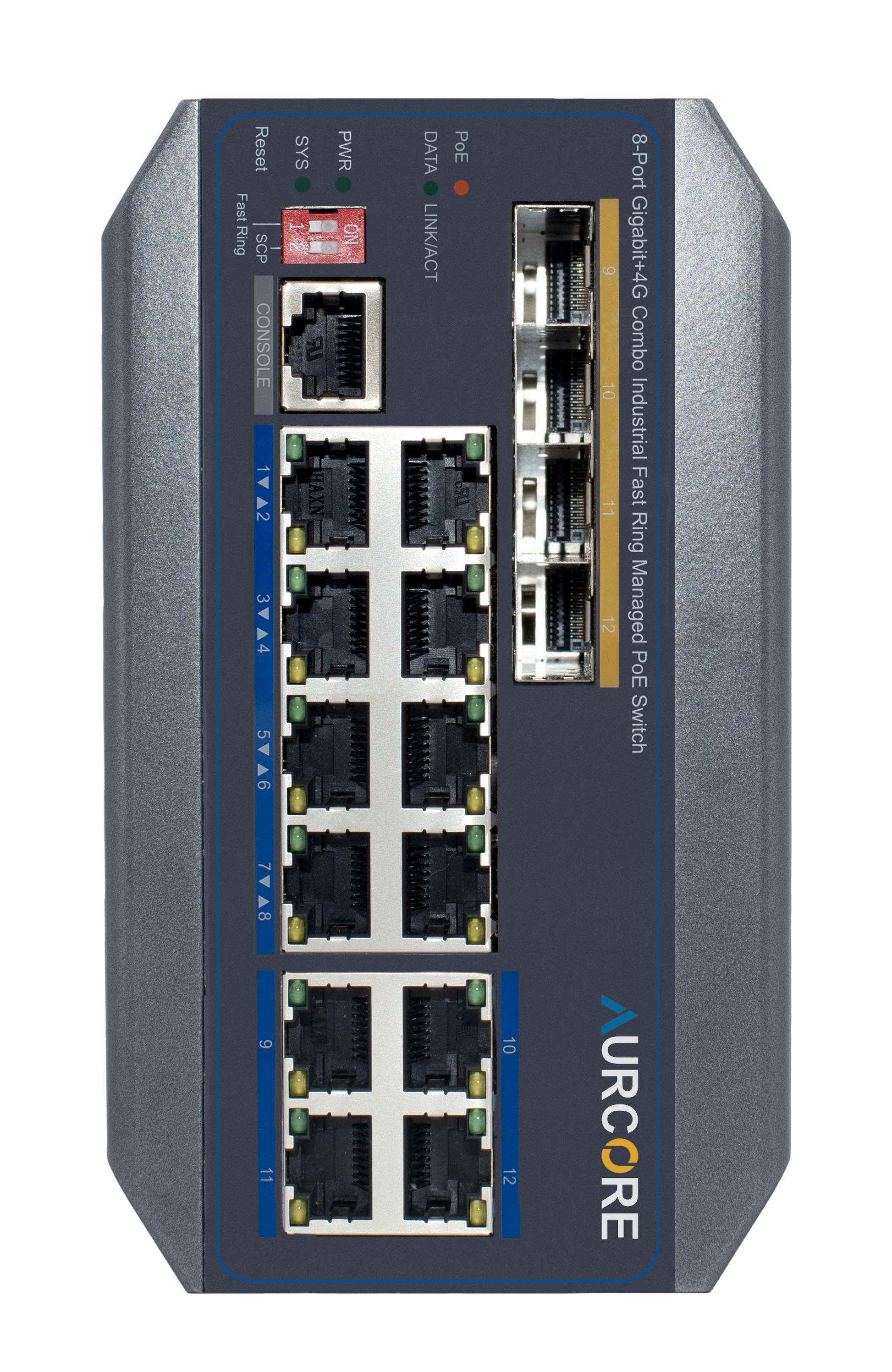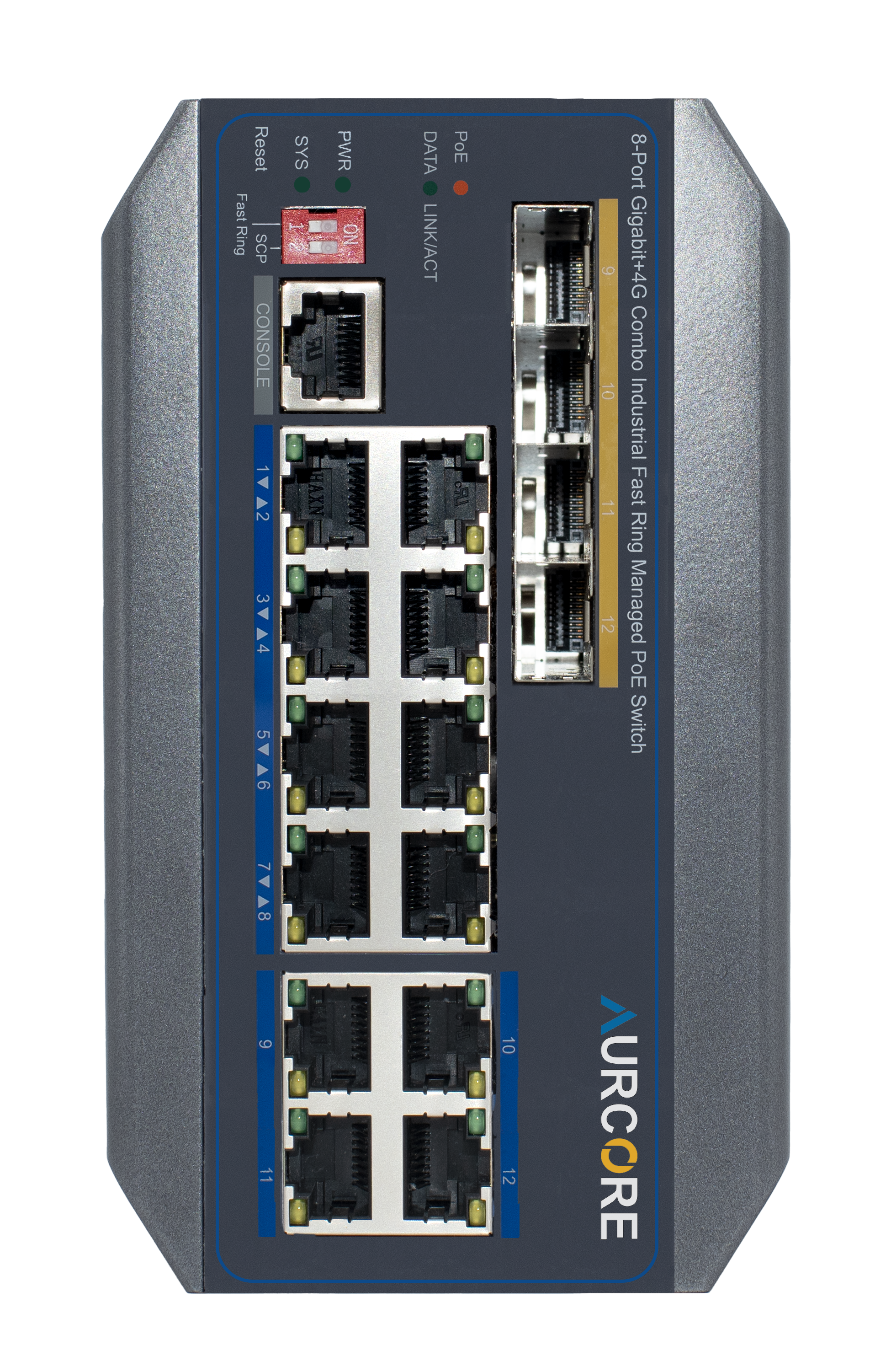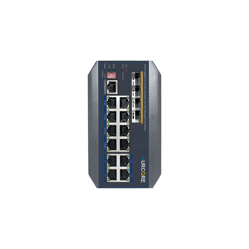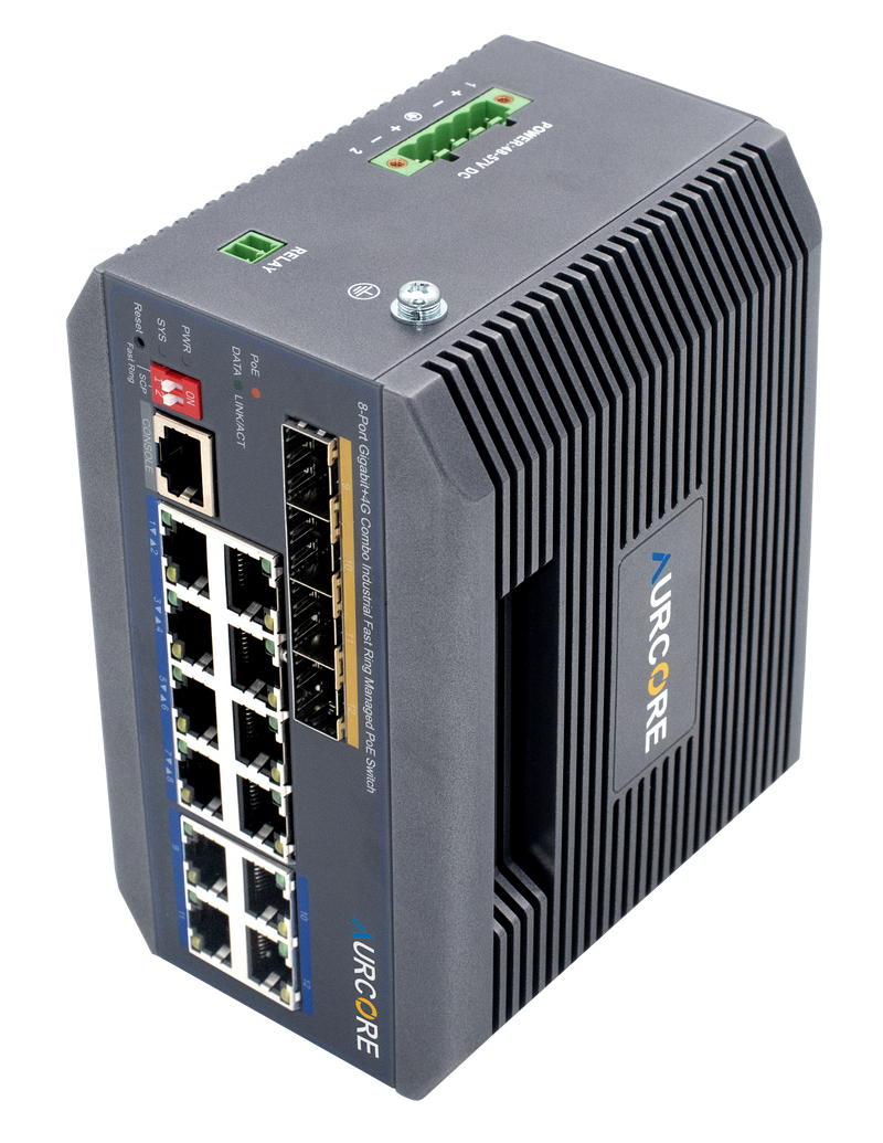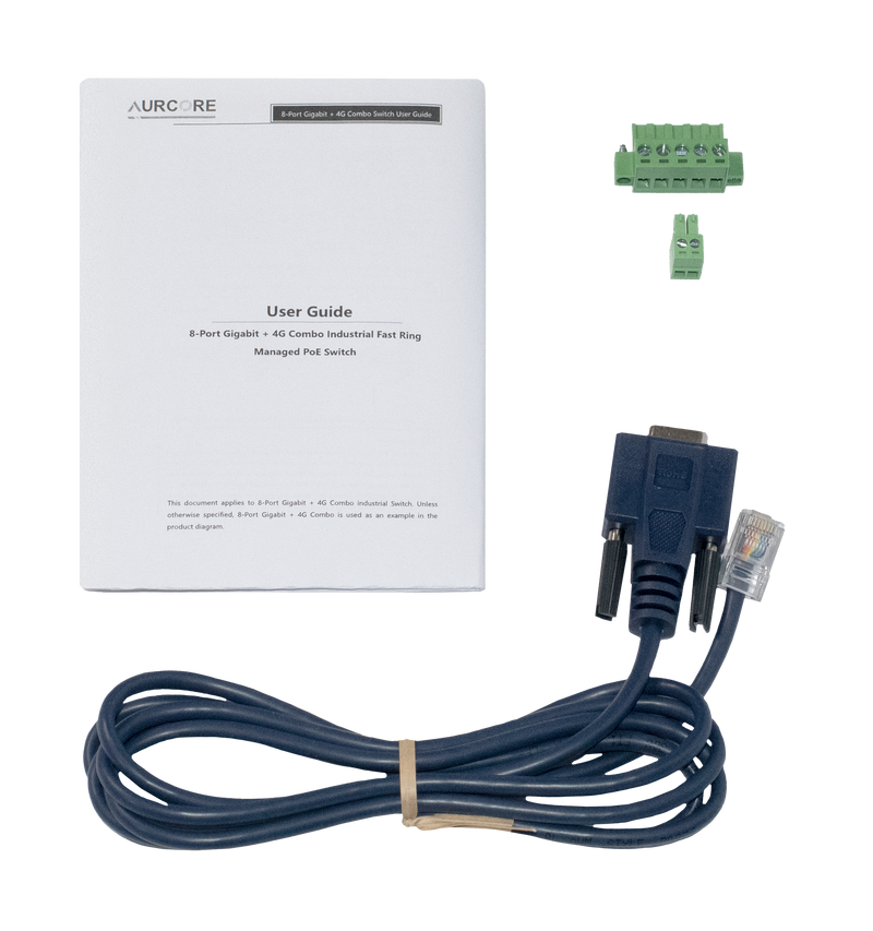 Note: A Power Supply Unit (PSU) is required for operation and is sold separately. For guaranteed compatibility and optimal performance, AurCore Technology recommends Mean Well power supplies, which have been fully tested and verified with our industrial switches.