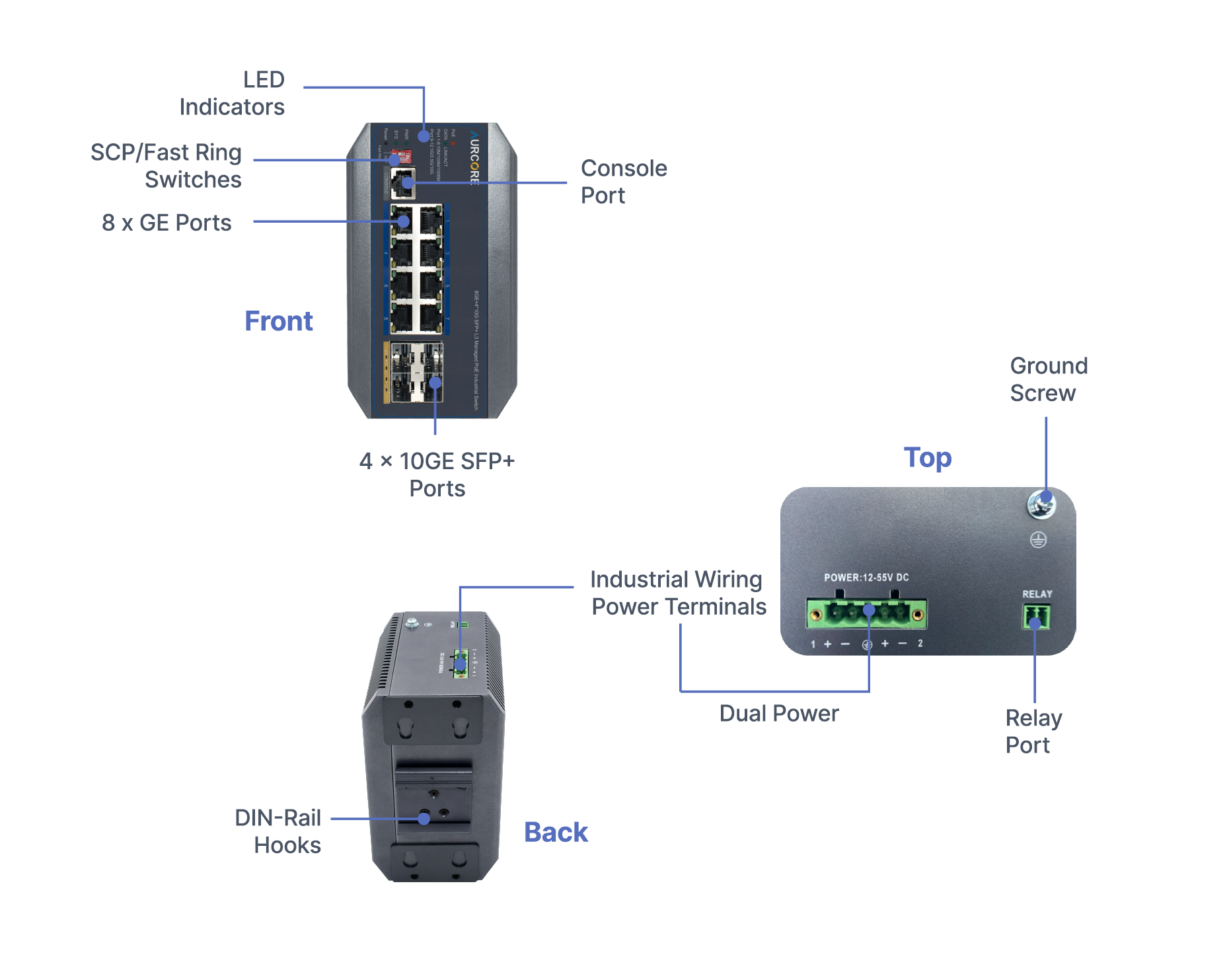 Note: A Power Supply Unit (PSU) is required for operation and is sold separately. For guaranteed compatibility and optimal performance, AurCore Technology recommends Mean Well power supplies, which have been fully tested and verified with our industrial switches.
